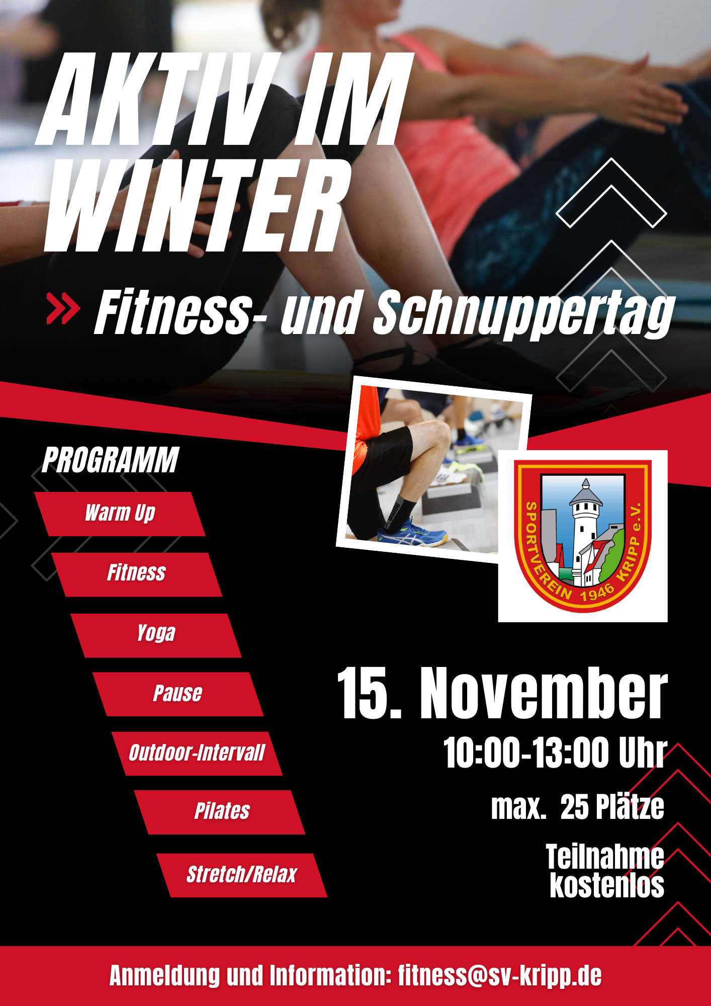 Die Teilnahme ist kostenlos, jedoch auf 25 Plätze begrenzt. Eine frühzeitige Anmeldung lohnt sich also. Anmeldung und weitere Informationen unter fitness@sv-kripp.de.