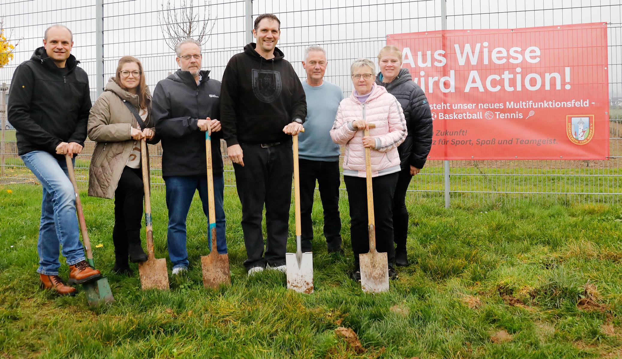 Am vergangenen Sonntag setzte der SV Kripp einen weiteren Meilenstein für die sportliche Weiterentwicklung des Vereins. Mit dem offiziellen Spatenstich begann der Umbau des bisherigen Bolzplatzes im Sportpark zu einem modernen Multifunktionsfeld, das zukünftig die Sportarten Fußball, Basketball und Tennis vereinen wird. Bereits einen Tag später begann die beauftragte Firma Schmickler mit den Erdarbeiten. Anschließend folgen der Aufbau des Unterbaus sowie umfangreiche Pflasterarbeiten. Im Frühjahr 2026 erhält das neue Spielfeld seinen sportlichen Feinschliff, wenn die Firma Polytan die finale Tartanschicht aufbringt. Damit entsteht ein robuster, ganzjährig nutzbarer Allround-Sportbelag.