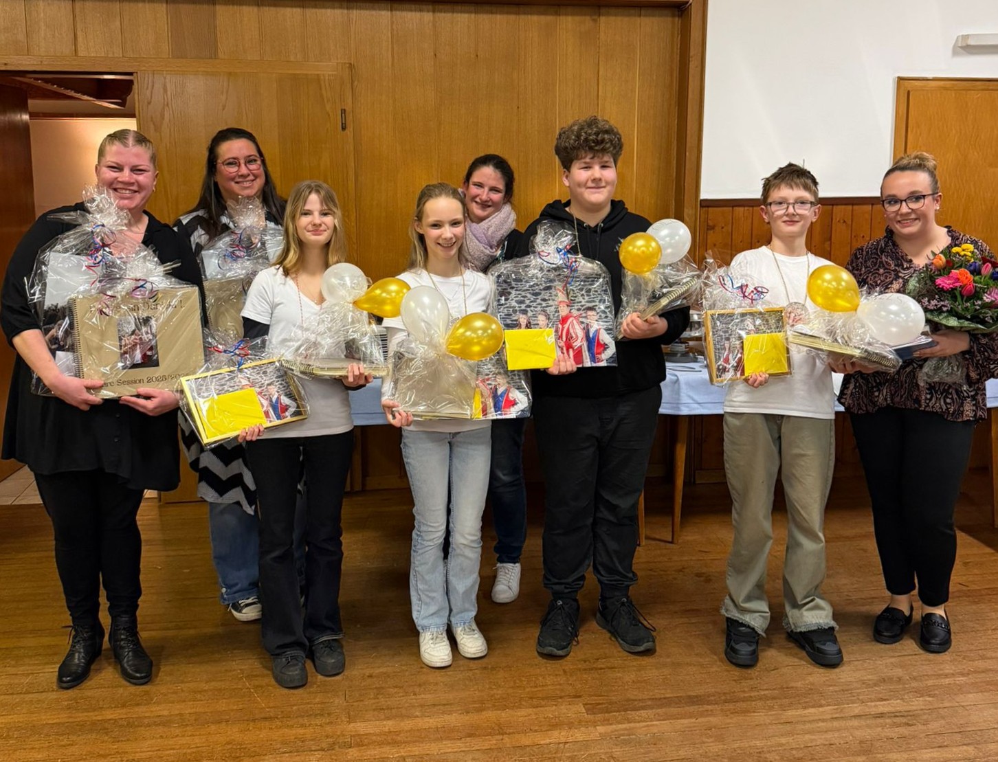 Ein besonderer Dank galt den Tollitäten der Session 2025/26. Allen voran dem Jugendprinzenpaar Ole I. (Spors) und Kim I. (Ludwig) begleitet von ihrer Hofdame Lilly (Prehn), Hofmarschall Nelson (Busch) und Prinzenführerin Larissa (Laux). Sie wurden für ihre tolle Regentschaft und ihren Einsatz während der Session mit Präsenten und viel Applaus gewürdigt.